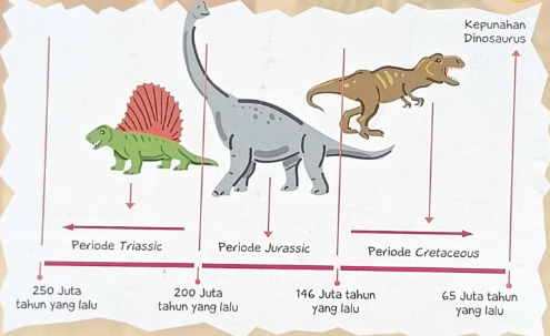 Dinosaurus di zaman ini pun punah, Periode Triassic berakhir, dan muncul jenis dinosaurus baru di Periode Jurassic