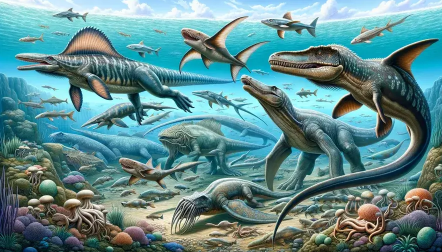 Di Periode Triassic, lautan dipenuhi oleh kerang besar bercangkang melingkar. Lautan dihuni oleh reptil raksasa seperti ichthyosaurus berbentuk lumba-lumba dan plesiosaurus berleher panjang dengan sirip dayung yang memangsa ikan dan cumi-cumi purba.
